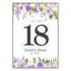 As rosas de creme branco de púrpura e marfim são acondicionadas em folhas verdes bonito e videiras roxas para criar bordas muito bonito ao longo da parte superior e inferior deste cartão de número de tabela. O número é escrito em uma fonte grande e escura de cinza que é muito fácil de ler. Os primeiros nomes do casal de casamento estão abaixo em uma letra elegante. A data do casamento segue uma letra itálica mais simples. Muito fácil e rápido de personalizar.