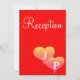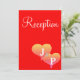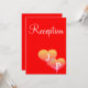 Design de amor de casamento romântico e único. Cartões de recepção de casamento com dois corações na frente em tons de pôr do sol em amarelo ouro e rosa sobre um fundo vermelho com texto branco. Personalize a parte de trás dos cartões de recepção com os detalhes do seu casamento (digite no lugar do texto de exemplo). Insira o monograma do sobrenome do casal casado em texto prateado. Design de Arte Original de TamiraZDesigns