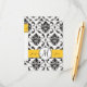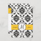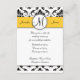 Convite de casamento elegante preto e branco com cartões de inclusão para recepção que você pode personalizar. Um belo padrão damasco ao fundo é acentuado com um enfeite circular e monograma sobre uma linha amarela contendo os nomes dos noivos. Efeitos do Photoshop com sombras dão a este cartão uma aparência 3D em camadas impressa diretamente no papel de sua escolha. Design do cartão de recepção de casamento por Elke Clarke ©2010, 2012. Gráficos licenciados. Uma maneira elegante de definir o tema do seu casamento. Personalize com os detalhes do seu casamento e informações da recepção e adicione ao seu pacote de casamento.