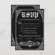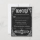 Aqui estão cartões de resposta de RSVP de casamento inspirados em Gothic Victorian em preto, apresentando ornamentos, pergaminhos, trabalho de pergaminho, uma faixa, uma moldura floral, fundo com padrão damasco e outros detalhes de estilo antigo, todos inspirados no período medieval gótico e na era vitoriana. Elegância e requinte em seu melhor. Você pode personalizar os campos de texto de amostra ao seu gosto.