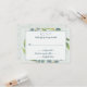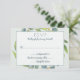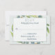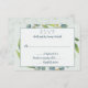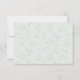 Cartões-resposta de folhas de eucalipto para um casamento. O cartão de 8,9 x 12,7 cm é azul-esverdeado claro com um grande fundo de guirlanda e aparência em camadas. Um painel esbranquiçado contém os modelos de texto em azul escuro com RSVP no topo. Personalize com a data de solicitação de resposta e sua escolha de como responder. Um site de casamento pode ser adicionado, ou texto tradicional "estará lá" "não comparecerá". Inclua um espaço para o número do convidado, se desejar. O verso do cartão tem um padrão leve de folhas. Atualize para um papel especial para combinar com os convites, conforme desejar.