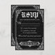 Aqui estão cartões de resposta de RSVP de casamento inspirados no estilo Vitoriano Gótico em preto, apresentando ornamentos, pergaminhos, trabalho de pergaminho, uma faixa, uma moldura floral, fundo com padrão damask e outros detalhes de estilo antigo, todos inspirados no período medieval gótico e na era vitoriana. Elegância e requinte em seu melhor. Você pode personalizar os campos de texto de amostra ao seu gosto.