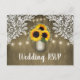Cartões de Resposta de Casamento em Pote de Pedra com Girassóis Country - apresentam um fundo único de madeira de celeiro com renda elegante e luzes cintilantes. Este design também apresenta um pote de pedra cheio de girassóis e baby's breath. O pote de pedra é decorado com iniciais que você pode mudar para as de sua escolha. Esta é uma alternativa econômica aos cartões de resposta tradicionais.