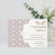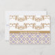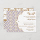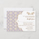 O elegante e belo azulejo francês marroquino inspirou cartões de resposta de casamento com uma lavanda roxa e cor-de-rosa e padrão geométrico de ouro design e floresces florais abarrotados de ouro. Esta placa RSVP luxo e escalável é perfeita para um casamento temático marroquino, árabe ou aladino. A parte traseira dessas placas de quadro de rico personalizadas pode ser personalizada com os nomes da noiva e do noivo na design de aparência de fita impressa. Trabalho de arte e design © Chrissy H. Studios, LLC. Todos os Direitos Reservados.