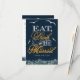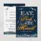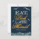 Cartões de RSVP de Casamento Náutico Azul Marinho e Laranja --combinam com os convites e mais encontrados abaixo nesta página. Complemente o tema do seu casamento náutico com esses convites que apresentam aves, ondas do oceano na parte inferior e a nova frase popular, "Coma, Beba e Case". Este design apresenta um fundo azul marinho com quatro aves brancas. A letra fancy é uma combinação de cores laranja e branco. As ondas na parte inferior são sombreadas em uma cor azul muito clara. A parte de trás apresenta o mesmo fundo azul escuro com uma moldura de onda ornamental branca para um toque adicional. Você pode atualizar o tipo de papel para opções mais sofisticadas para cima à direita. Cada RSVP vem com um envelope branco ajustado. Veja o convite de casamento correspondente abaixo para detalhes do design.