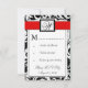 Cartões de RSVP de casamento em damasco preto e vermelho - combinam com os convites e mais encontrados abaixo nesta página. Cada cartão de resposta apresenta uma impressão de damasco de folhas florais em branco sobre um fundo preto. A frente e a parte de trás também apresentam uma faixa vermelha aparada em preto com um monograma quadrado que você pode personalizar para a inicial do sobrenome do noivo. Estes cartões de RSVP são feitos em papel de alta qualidade; no entanto, você pode mudar o papel para linho, feltro (em relevo), reciclado e várias tonalidades metálicas, se desejar, sob o número 2 (escolha seu estilo, tamanho e tipo de papel) abaixo do botão laranja "adicionar ao carrinho". Uma lista dos custos adicionais para um papel mais sofisticado também é exibida sob essa opção. Cada RSVP vem com um envelope branco ajustado.