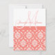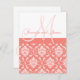 Monograma elegante, Nomes Cartões RSVP de Damasco Coral para combinar com o design de Convite de Casamento de 5 x 7 polegadas em nossa loja. RSVP Card Monograma e Nomes Layout e Design por Elke Clarke © 2008, 2009, 2010. Cor damasco Licensed.com e WhiteWhimsicalWeddings.blogspot.com. Personalize com seus nomes de monograma e cores de casamento. Adicione todas as informações de RSVP de casamento na parte traseira do cartão usando os prompts de menu fáceis de usar do Zazzle.