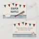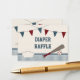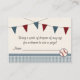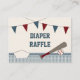 Cartões de rifa de fraldas para chá de bebê temáticos de beisebol vermelho e azul com uma linha de flâmula e bandeira vermelha e azul. Claro que um cartão de solicitação com tema de beisebol não estaria completo sem um taco de beisebol, bola e placa de origem em uma borda xadrez azul e branca. Personalize a frente e o verso deste cartão interno com sua própria redação. Arte e ilustração © Chrissy H. Studios, LLC. Todos os direitos reservados.