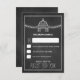 Cartões de RSVP de Casamento de Loja de Fazenda Rústica Country - apresentam um fundo de quadro-negro preto impresso na frente e no verso. Este design apresenta um celeiro ou fazenda branca com um cata-vento de galo perto do topo com luzes de corda. Este design pode ser atualizado para várias opções de papel e forma encontradas acima.
