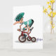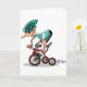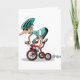 Um legal design de um guincho em um triciclo. Este design vê o tipo no triciclo a agarrar os dentes quando está fora de corrida. O triciclo é vermelho e o cara está vestindo uma camisa verde e um capacete. Este racer no tricycle design parece excelente nestas placas de saudação