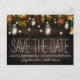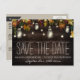 Cartões de Save the Date de Casamento com Jarra de Mason de Firefly de Outono - apresentam um fundo de madeira de celeiro rústico com folhas de bordo, carvalho e outras folhas em cores de outono -- vermelho, borgonha, amarelo, verde e laranja com luzes cintilantes por toda parte. Jarras de Mason cheias de luzes ou fireflies também são adicionadas ao design.