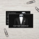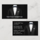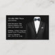 Cartões de visitas clássicos para um serviço Formalwear ou Tuxedo Rental desenhado com um traje masculino na frente e atrás neste design de lado duplo já organizado para que você substitua nosso texto pelo seu.
