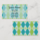 Estes cartões de visitas caracterizam um teste padrão formal do argyle na cerceta, iluminam-se - azul e saltam-se verde com os "pontos de contraste" do preto em um fundo verde pálido. O texto preto do roteiro di-lo "obrigados," mas pode mudá-lo a o que quer que você gostaria, ou removem a tira e o texto completamente. Procure o outro design da modificação Argyle em nossa galeria.