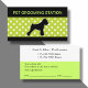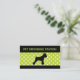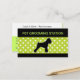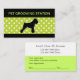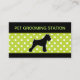 Cartões de visitas de esmerilamento com belos padrões na moda verde e bolinhas brancas em um plano de fundo preto, com a imagem de um cão na frente e o layout de texto lateral que você pode personalizar e personalizar que inclui um modelo de compromisso. Mande suas cartões de visitas com estilo, este modelo foi projetado para um martelo de animais de estimação, aliciamento móvel de animais de estimação ou butique de animais de estimação.