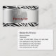 Cartões de visitas de cabeleireiro de beleza moderna com fundo metálico prateado simulado, um padrão de stripes de zebra e um layout de texto de excelente que você pode personalizar em dois lados. Design de estilo modelo fácil que você pode alterar ao seu gosto. Melhores cartões de visitas para salões de beleza, cabeleireiros, cabeleireiros ou cortadores de cabelo independentes.