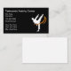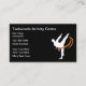 Os cartões de visitas de temas para instrutores da classe Taekwondo projetados com uma classe de arte marcial em ação posiciona profissionais em tons brancos e dourados para uma visão de alto nível em preto.
