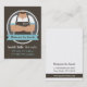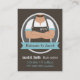 Um na moda, hipster e legal pegue o compro clássico de barbeiro. Ele tem uma ilustração vetorial de um barbeiro masculino com braços fortes e uma barba que está vestindo uma simples teia branca e um avental marrom-escuro. O avental segura suas ferramentas de corte de cabelo, como pente e tesoura, para fácil acesso. Paleta colorida de castanho, azul e branco. Para barbeiros masculinos, cabeleireiros e salões de cabelo que gostam de um cartão de visita único.