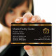 Modelo de cartão de negócios clássico de corretor imobiliário apresentado num símbolo de casa com aspecto metálico dourado e linha divisora decorativa. Eu projetei este modelo de cartão de negócios para um corretor de imóveis, corretor, ou agentes e agências, e ele é apresentado em nosso estoque de cartão de formato grande mais alto que o tamanho padrão para maior impacto.