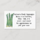 Novos cartões de visitas de espargos para promover seu nome comercial, local, horas etc. É fácil personalizar o texto no formulário de modelo. Há uma pintura de sete lanças de espargos frescos no lado esquerdo. O seu texto está à direita. Há itens correspondentes neste repositório. Obrigado por comprar CherylsArt no Zazzle.