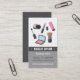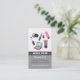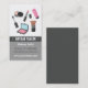 Um na moda, cartão de visita com ilustração digital de vários acessórios de maquiagem e essenciais como batom, rímel, pincel de pó facial e caixa de paleta de pincel. Perfeito para maquiadores, estilistas e da indústria de moda e cosmética. Personalize facilmente com seus detalhes de contato.