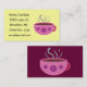 Estas cartões de visitas de caneca de café quente apresentam uma caneca de chá deliciosa em uma xícara rosa com flores roxas nela! Esses cartões de visitas são uma maneira criativa de fazer uma declaração e são excelentes de usar como cartões de contato pessoais! Preencha o seu próprio nome, endereço, correio eletrônico, número de telefone e Web site ou quaisquer outras informações de que necessite para preencher facilmente o modelo! Excelente para um amante de café, dono de café ou empregado de uma cafeteria ou barista!