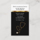 cartões de visitas de seguros médicos de várias linhas com design preto e branco poderoso de dois lados que inclui uma linha divisora dourada impressa na frente, um símbolo de estetoscópio médico e um layout de texto que você pode personalizar, tudo apresentado em um formato cartão de visita vertical. Melhores cartões de visitas para um agente de seguro médico, agência e seus representantes de vendas.