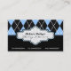 Cartões de visitas de tendências de argyle branco azul preto, com um padrão de estilo azul e branco. A parte inferior é de cor preta sólida. Uma faixa preta e azul separa as duas partes. Sua empresa/nome é digitado em uma etiqueta elegante de umbragem com contorno preto e rosa. Design bonito e moderno com retrorreflector, que pode ser usado para muitas áreas de negócios como interiores, cabeleireiro, moda e muito mais.