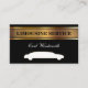 Cartão de visita de driver Classy Limo para chauffeur profissional com silhueta emblem de som ouro simulada em escala superior e layout de texto editável que você pode personalizar neste design de modelo de cartão de negócios inteligente de dois lados. Projetado para serviço de carro, aluguer de carro, empresa de limusine ou serviço de táxi.