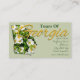 Embora por vezes se chame o "Estado Império do Sul", o apelido oficial da Geórgia é "O Estado de Pêssego". Não admira. A Geórgia é o produtor número um de amendoins, pecanos e pêssegos. O Rosa Cherokee, adorável e perfumado, tem uma triste história associada a ela. Um acontecimento trágico, em 1838, em que milhares de Cherokee foram forçados a sair da Geórgia e de outras terras a leste do rio Mississippi. O caminho percorrido pelos Americanos nativos foi chamado de "Trilha das Lágrimas" por causa das lágrimas derramadas pelas mulheres Cherokee na viagem e por causa do número de Americanos nativos que morreram no caminho. Chefes, dizem, rezaram por um sinal para dar esperança às mulheres. Diz-se que onde quer que uma lágrima caísse, um Rosa Cherokee florescia. As flores continuam florescendo ao longo do caminho hoje. A Geórgia tornou-se o 4º Estado em 1788. Como um dos nossos estados "mais velhos", é surpreendente que a canção estatal "Georgia On My Mind" tenha sido adotada em 1979 e que a bandeira oficial do estado só remonte a 2003. Por toda a sua rica história, boa e má, a Geórgia é o lar de uma das cidades mais contemporâneas do país: Atlanta. Atlanta também é o berço da Coca-Cola. Este design encantador homenageia este belo estado. O esboço do estado está cheio dos lindos florescimentos brancos do Rosa Cherokee. Isto é colocado em camadas com o ouro amarelo "Georgia". Estes cartões de visitas encantadores e perfeitamente personalizáveis são uma excelente escolha para os Guias de Volta da Geórgia, agências de Viagem da Geórgia ou qualquer negócio associado ao turismo na Geórgia.
