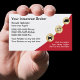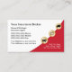 Cartões de visitas de corretores de seguros com o design vermelho moderno, juntamente com a imagem de um veículo doméstico, automóvel e recreativo que representa o seguro dos proprietários de casas, o seguro dos viajantes e o seguro automóvel. Projetado para um agente, agência, representante independente ou corretor.