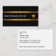 Cartões de visitas clássicos para um serviço de segurança criado com uma estrela de tom de ouro impressa digitalmente e um gráfico de banner de nome de empresa, juntamente com dois layout lateral organizado e pronto para personalização on-line. Funciona para segurança de dados, cibersegurança, corporativa ou privada.