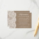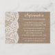 A coleção de burlap & lace é um design impressionante que apresenta um adorável fundo de efeito de burvolta rústica com um romântico de efeito de renda branca vintage. Esses Cartões Detalhados podem ser personalizados para sua ocasião especial e tornariam a inserção perfeita para qualquer suíte de casamento rústico, chá de panela, festa de noivado, festa de aniversário e muito, muito mais. Essas placas podem ser usadas para criar Cartões de Detalhes, Cartões de Informação Convidados, Cartões de Alojamento, Cartões de Direção, Registro de Presente ou Cartões de Poço de Vestir, bem como Cartões de Cerimônia e Recepção. *Observe que o Zazzle só vende cartões impressos para que esses cartões não tenham nenhum material real de burlap ou de renda.