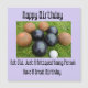 Mostrado na lavanda estão bolas de boliche de jardim vintage com uma mensagem de aniversário