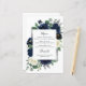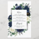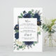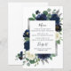 Design apresenta uma elegante camada floral de aquarela decorada com peônias, rosas, eucalipto verde e mais em tons de marinho azul, verde e marfim. Design também apresenta uma caixa de cinza prateada por baixo da coroa com um layout de texto moderno. Um arranjo floral correspondente é adicionado ao verso do carregar sobre o tema geral. Você pode personalizar completamente o texto, a fonte, o tamanho e muito mais para atender às suas necessidades!