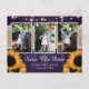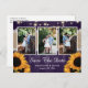 Estes cartões postais de foto de salvar a data do casamento rústico roxo apresentando burlap, renda e fundo de madeira de celeiro com girassóis são ideais para uma festa de casamento rústica roxa inspirada em girassóis.