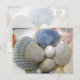 Cartões postais de fotografia de conchas azuis. A fotografia de conchas tropicais inclui quatro conchas de berbigão azuis e bege dispostas em círculo com uma concha de caracol lunar branco ou olho de tubarão no centro. Essas conchas vieram da costa do Golfo da Flórida.