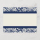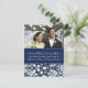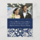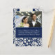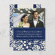 Anúncio da emoção Cartões-postais em elegante azul marinho escuro e creme de cor damasco floral branca, personalizável com seus nomes, fotos de casamento e detalhes de casamento, a maneira perfeita de anunciar que você fugiu para amigos e família. Disponível em uma grande variedade de produtos de casamento correspondentes.