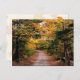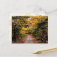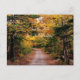 Cartões-postais de casamento de outono para salvar a data. Fotografia de uma pitoresca estrada secundária tirada na Nova Inglaterra mostra uma trilha arborizada através da floresta com folhagem espetacular amarela e laranja. Personalize usando o texto do modelo, em verde escuro, no verso. São fornecidas linhas para adicionar endereços.
