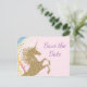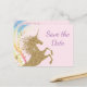 Cartões postais de salvar a data da festa de aniversário do unicórnio com lindo unicórnio dourado em um fundo de redemoinho de arco-íris. Esses cartões postais de salvar a data da festa de aniversário do unicórnio são facilmente personalizados para o seu evento, basta adicionar seus detalhes no estilo de letra que preferir. Você também pode alterar a cor do fundo. Este é um design impresso sem brilho real.