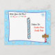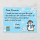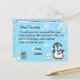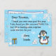 Flocos de neve brancos e azuis fofos, com um pinguim festivo adorável jogando uma bola de neve e uma carta personalizada do Papai Noel na frente. O verso tem um espaço para a criança escrever sua lista de desejos de Natal.