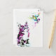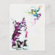 Aquarelas foram usadas para fazer imagens de um gatinho observando um beija-flor voando sobre ele. Isto é um impressão num cartão postal.