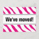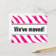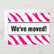 Cartões postais modernos com faixas de zebra cor-de-rosa. Texto de movimentação personalizado; nós movemos! Adicione seu novo endereço no verso. Novos cartões modernos para casa e negócios. Excelente ideia para mudar restaurantes.