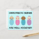 Este design apresenta quatro lindos bebês multiculturais, meninos e meninas, dois até têm pacificadores! O texto diz "Os Bebês Chiropráticos Estão Bem Ajustados!"
