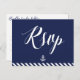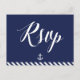 Cartões postais RSVP de casamento náuticos com faixas marinho azul e branca, âncora branca e texto branco personalizado, impressos em fundo azul marinho