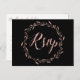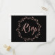 Cartões postais de RSVP de Casamento com efeito folha de ouro rosa com coroa floral e texto personalizado, impressos em fundo preto