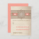 cartão RSVP de casamento náutico de coral com faixas castanhas, iniciais de casal e roda de barco rústico antiga com corda.