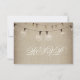 String of Lights Rustic Country Wedding RSVP Cards com um fundo castanho angustiado e duas cordas de luzes cintilantes penduradas no topo. Estas são excelentes para casamentos rusticais e temas de casamento vintage, ou casamentos de jardim ao ar livre. cordas de luz do casamento cartões rsvp, luzes penduradas cartões rsvp, luzes cintilantes, casamentos vintage rusticados, cartões de resposta, cartões de resposta