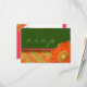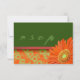 Placas RSVP de casamento modernas, de cor laranja e guião verde, com uma impressão verde-azul e cor-de-laranja com uma flor de gerbera laranja no canto. Coordenar a papelaria de casamento está disponível no Local de Casamento de Rizziez. Há duas versões desta placa RSVP de estilo. Este tem um verde mais brilhante.