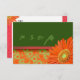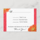 Placas RSVP de casamento modernas, de cor laranja e guião verde, com uma impressão verde-azul e cor-de-laranja com uma flor de gerbera laranja no canto. Coordenar a papelaria de casamento está disponível no Local de Casamento de Rizziez. Há duas versões desta placa RSVP de estilo. Este tem um verde mais brilhante.