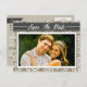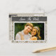 Cartões salve a data Chalkboard Burlap & Lace Photo - apresentam um fundo de burlap and lace com uma banda impressa no quadro chalkboard com a opção Save the Date no topo. Salvar a Data está em um script elegante para adição de decoração rústica ou country. Altere o casal da demonstração para uma imagem de sua escolha.